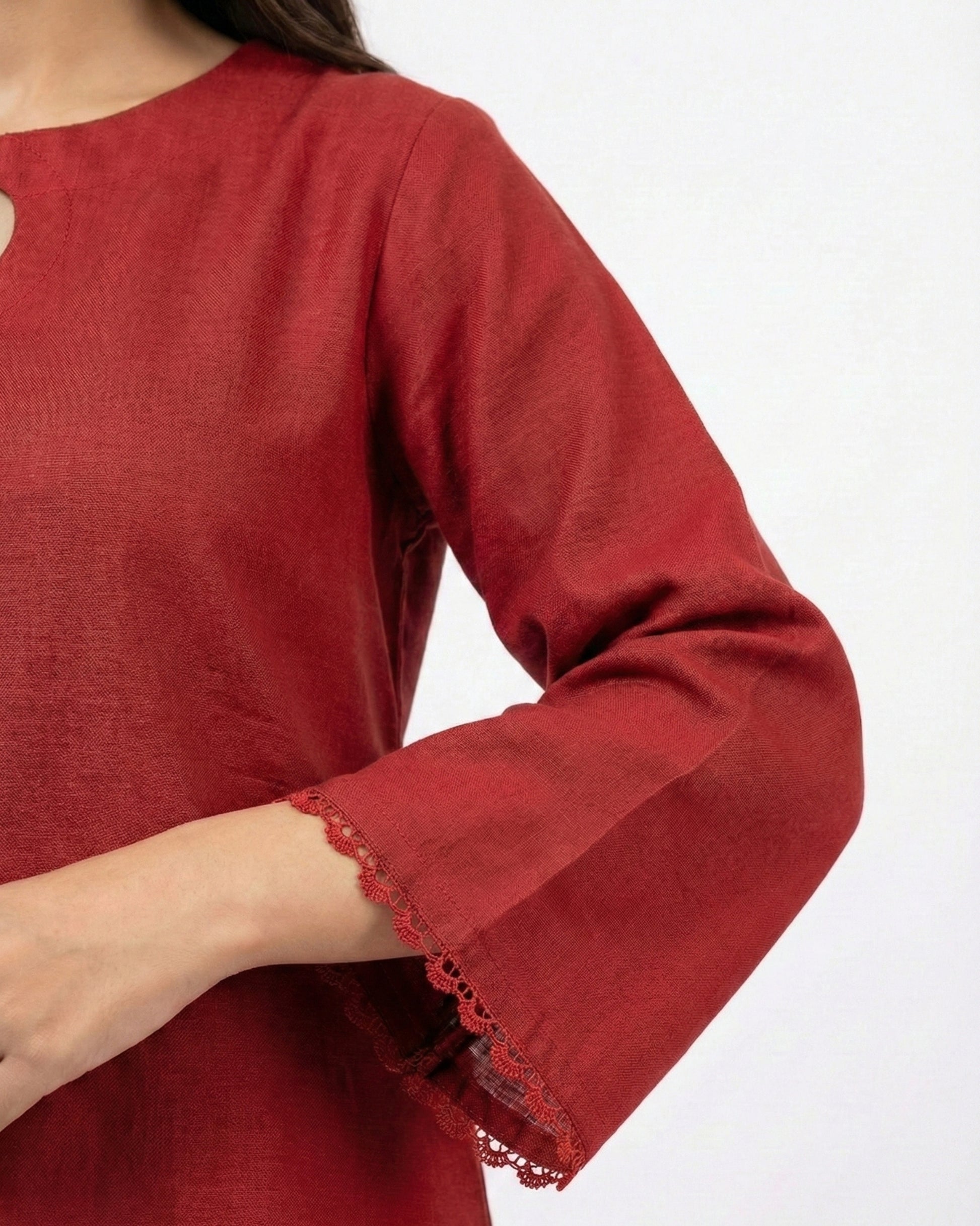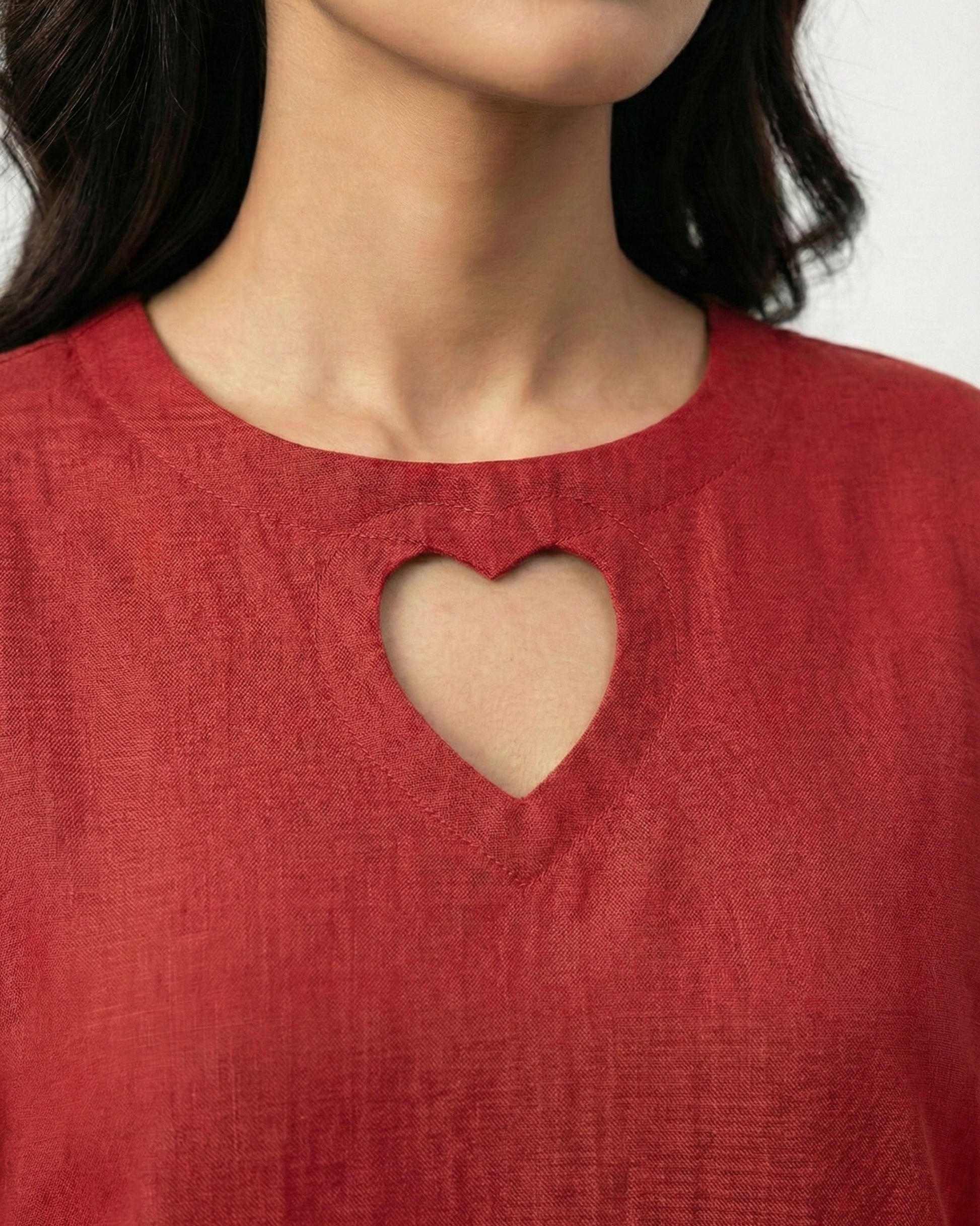 A summer-ready 2-piece in premium linen, designed in a rich ruby tone with a signature heart cut out neckline. The long, easy silhouette keeps it breathable and elegant, while the matching heart motif trouser adds charm without feeling loud. Finished with delicate lace edging on sleeves and hem for that “quiet luxury” look. Perfect when you want something comfortable, cute, and still polished.