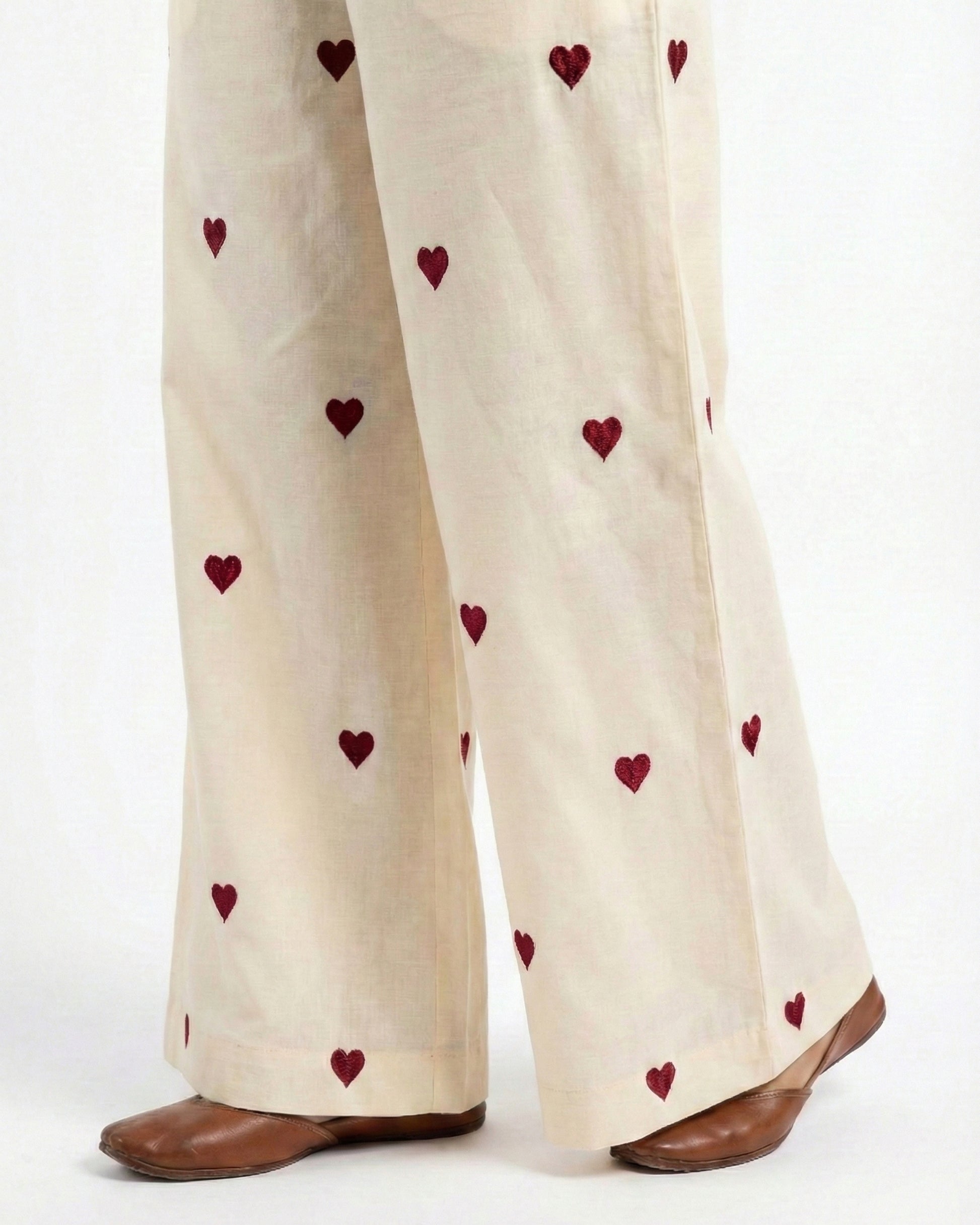 - Coordinated heart motifs on trouser for a complete look
