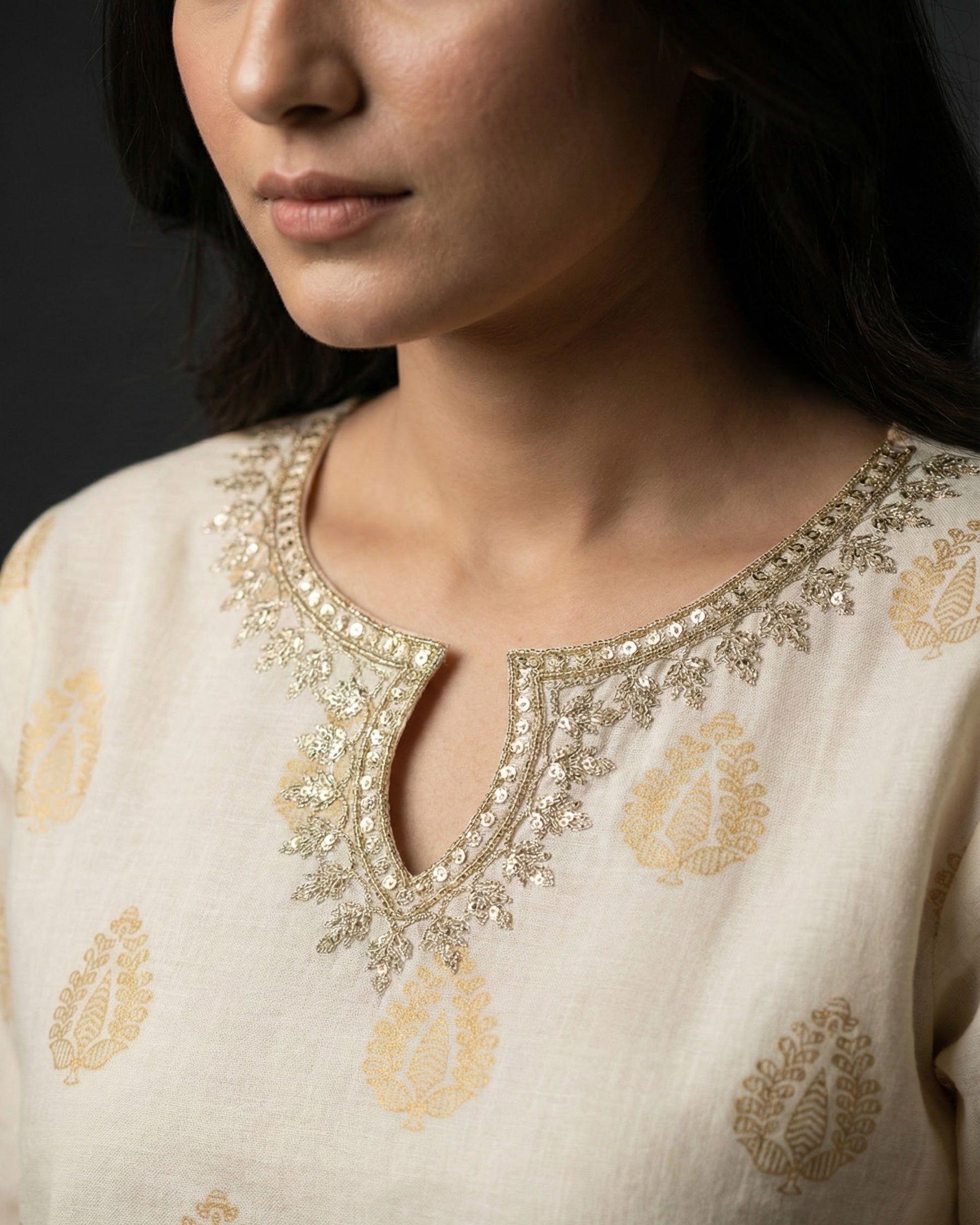 - Neckline: Keyhole style with embellished embroidery + subtle shimmer detailing