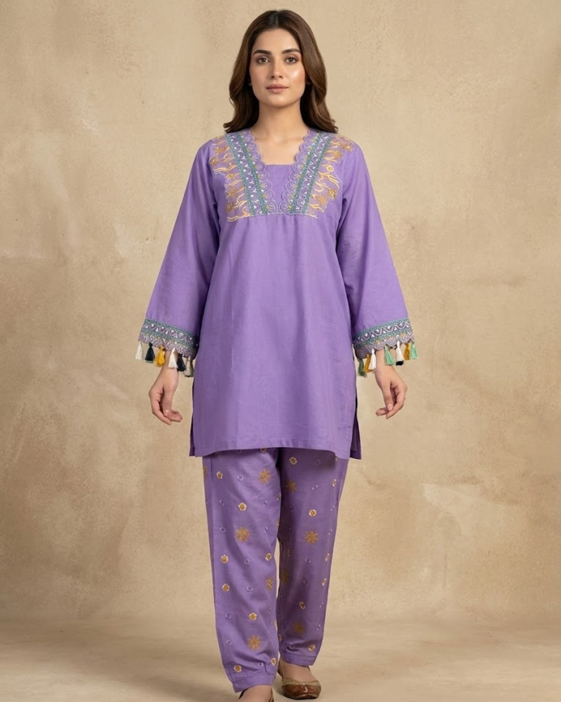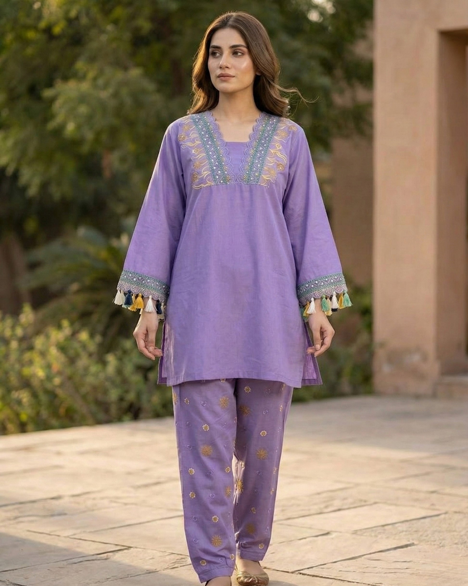 Meet Orchid a rare bloom known for quiet luxury, grace, and soft statement beauty. A lilac toned premium lawn suit designed to feel airy, polished, and effortlessly pretty. The embroidered neckline and sleeve trims add just enough detail without feeling heavy. Finished with playful multicolor tassels for that “noticed-but-not-loud” charm. A 2-piece long shirt + trouser set made for sunlit days and dressed-up summer plans.