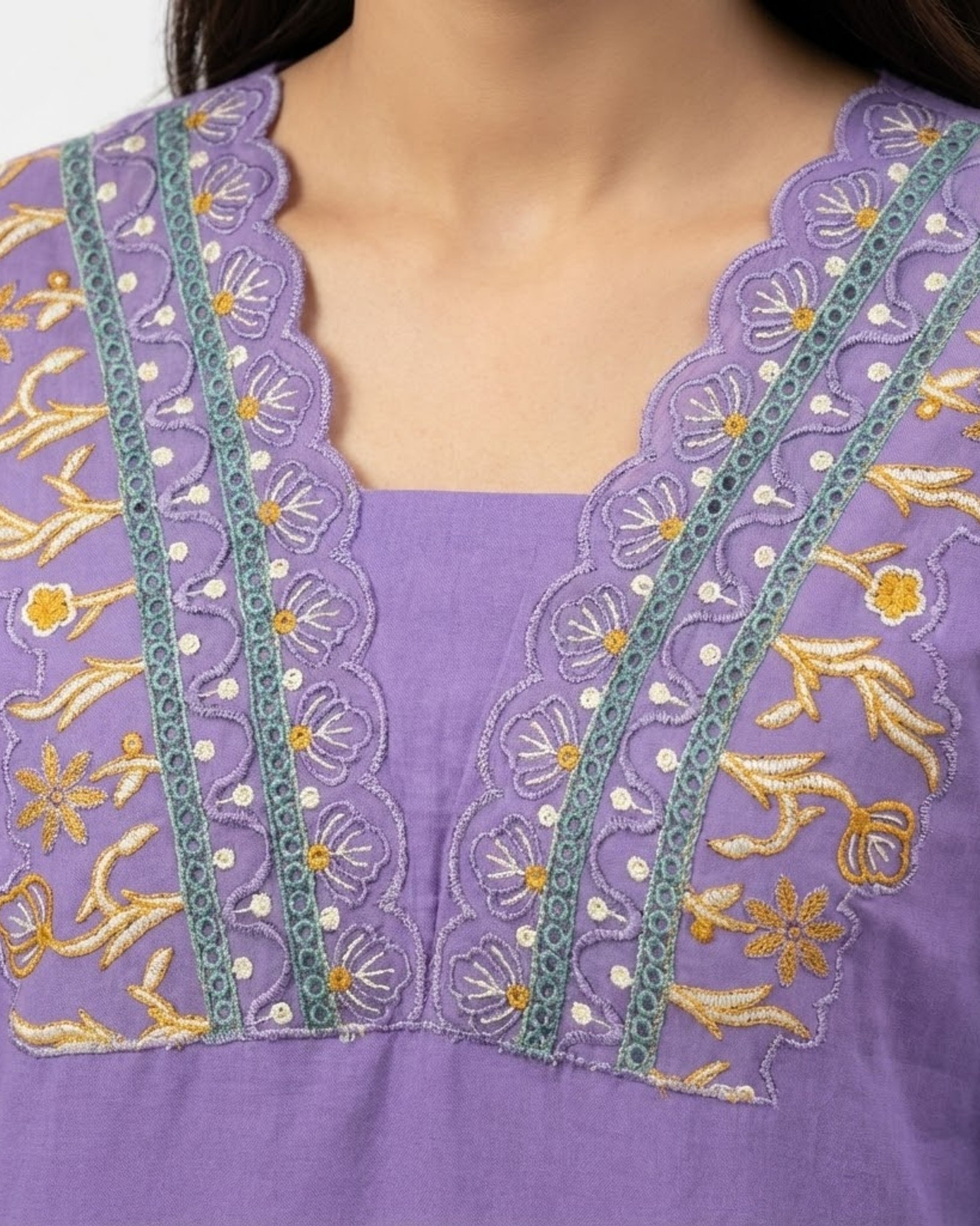 - Neckline: Scalloped embroidered neckline panel
