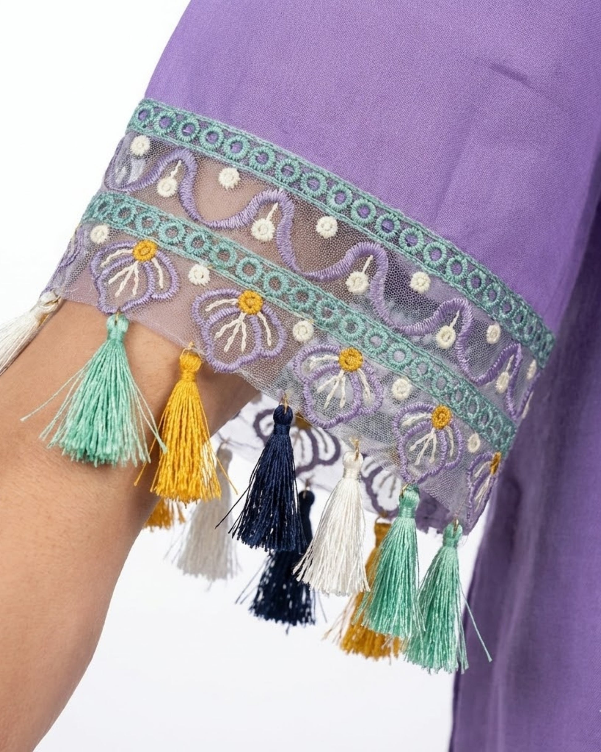 - Sleeve borders finished with playful multicolor tassels (the “signature” detail)