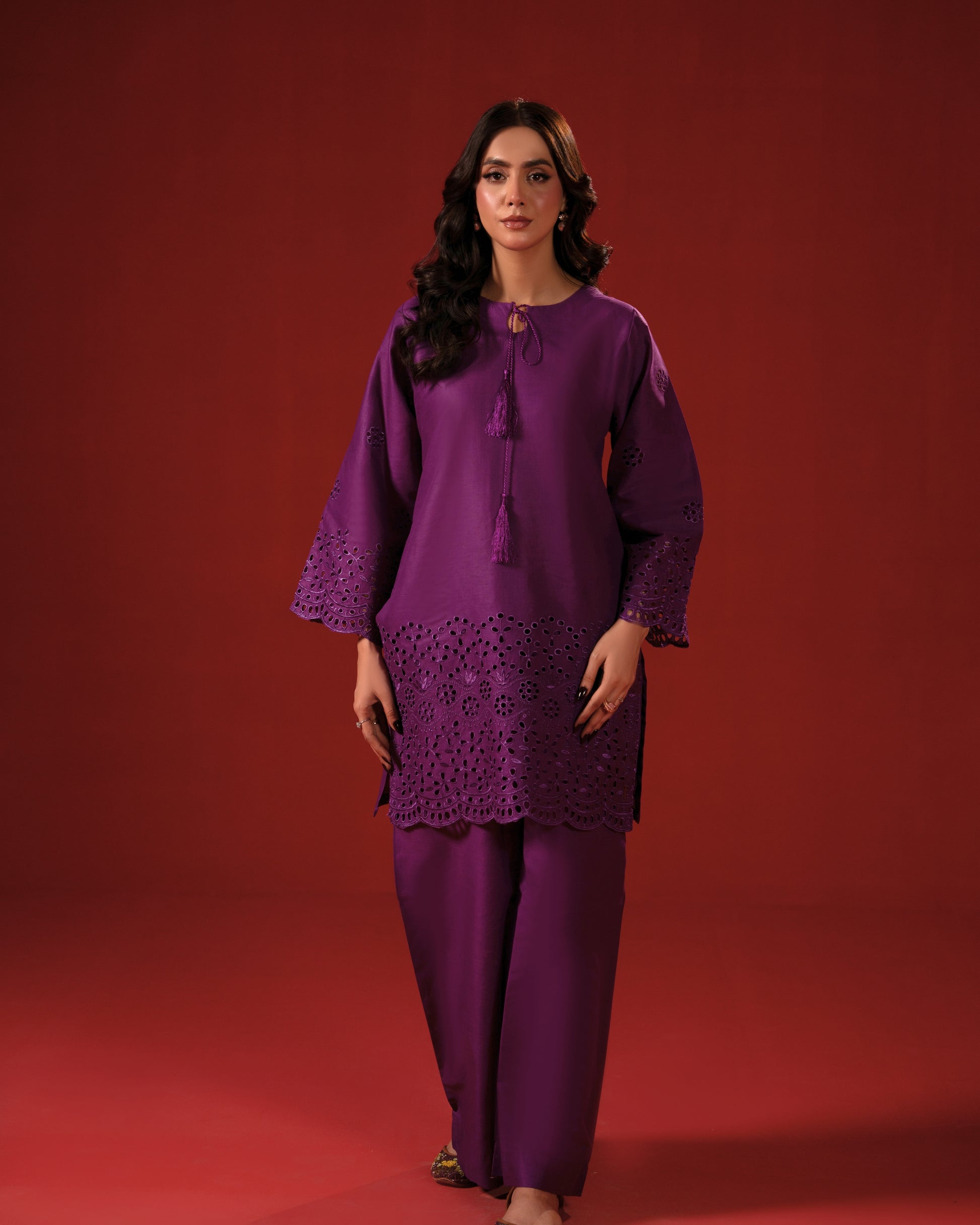 Plum a rich, royal shade that instantly elevates your summer look. A statement purple 2-piece stitched suit crafted in premium lawn for summer comfort. Finished with bold schiffli/cutwork borders on sleeves and hem for a luxe handcrafted feel. Neckline tie up with tassels adds a soft, feminine detail without being extra. Wear it day to night easy, elegant, and always picture perfect.