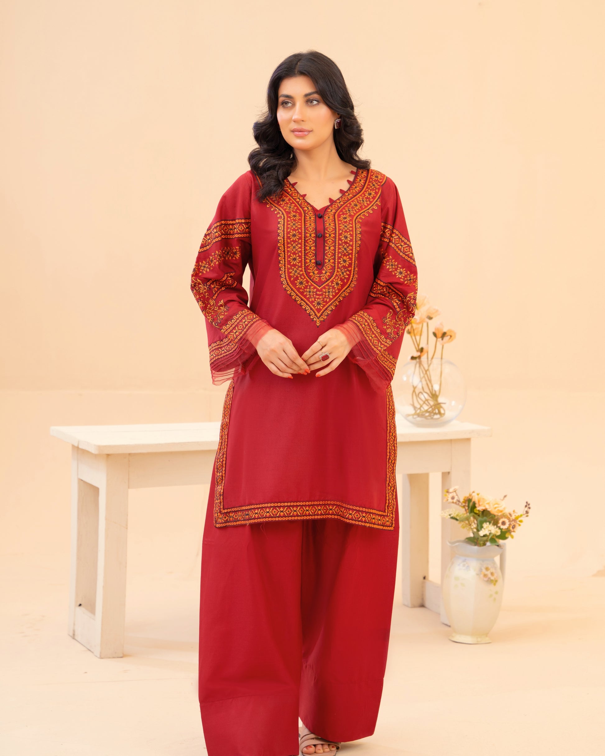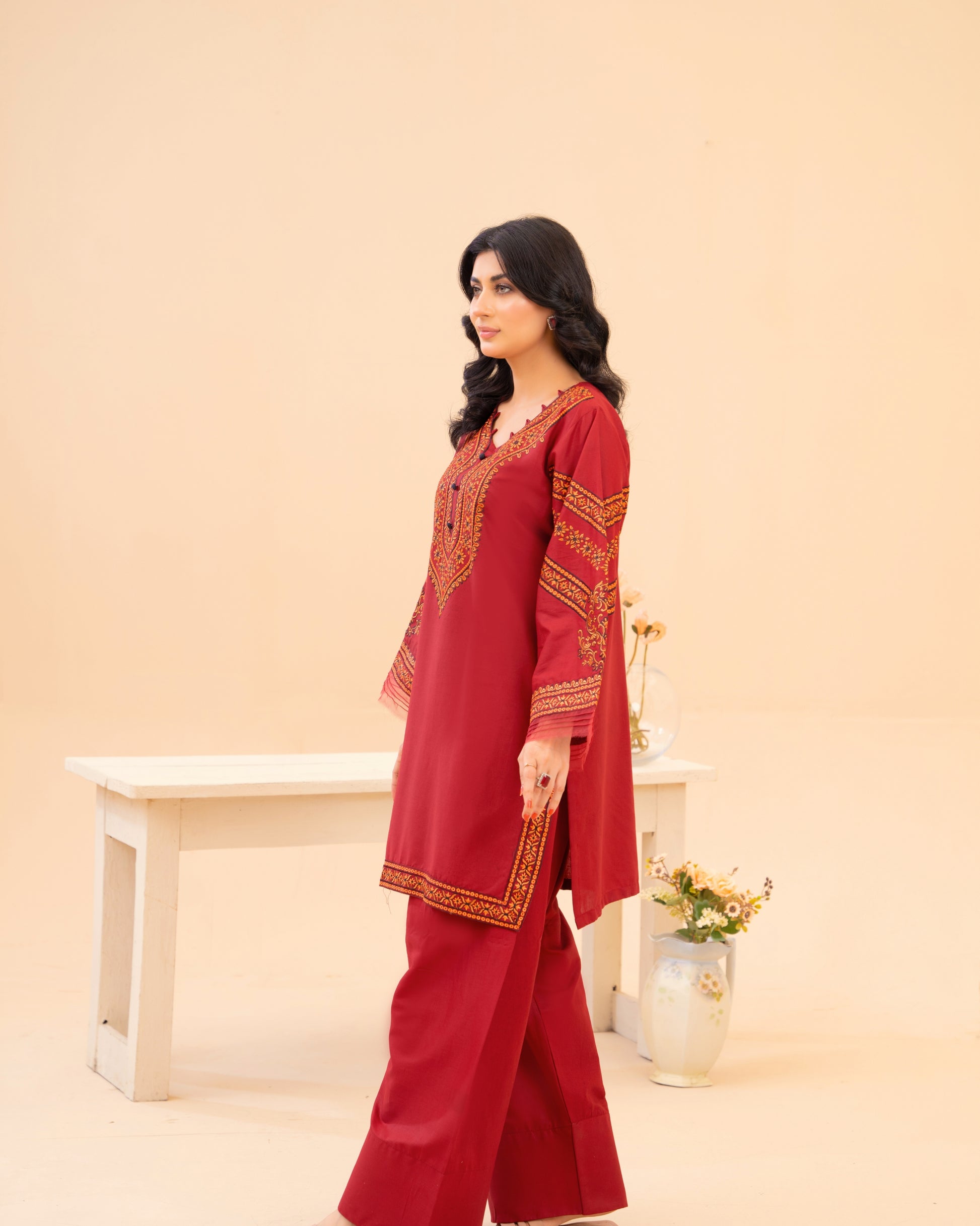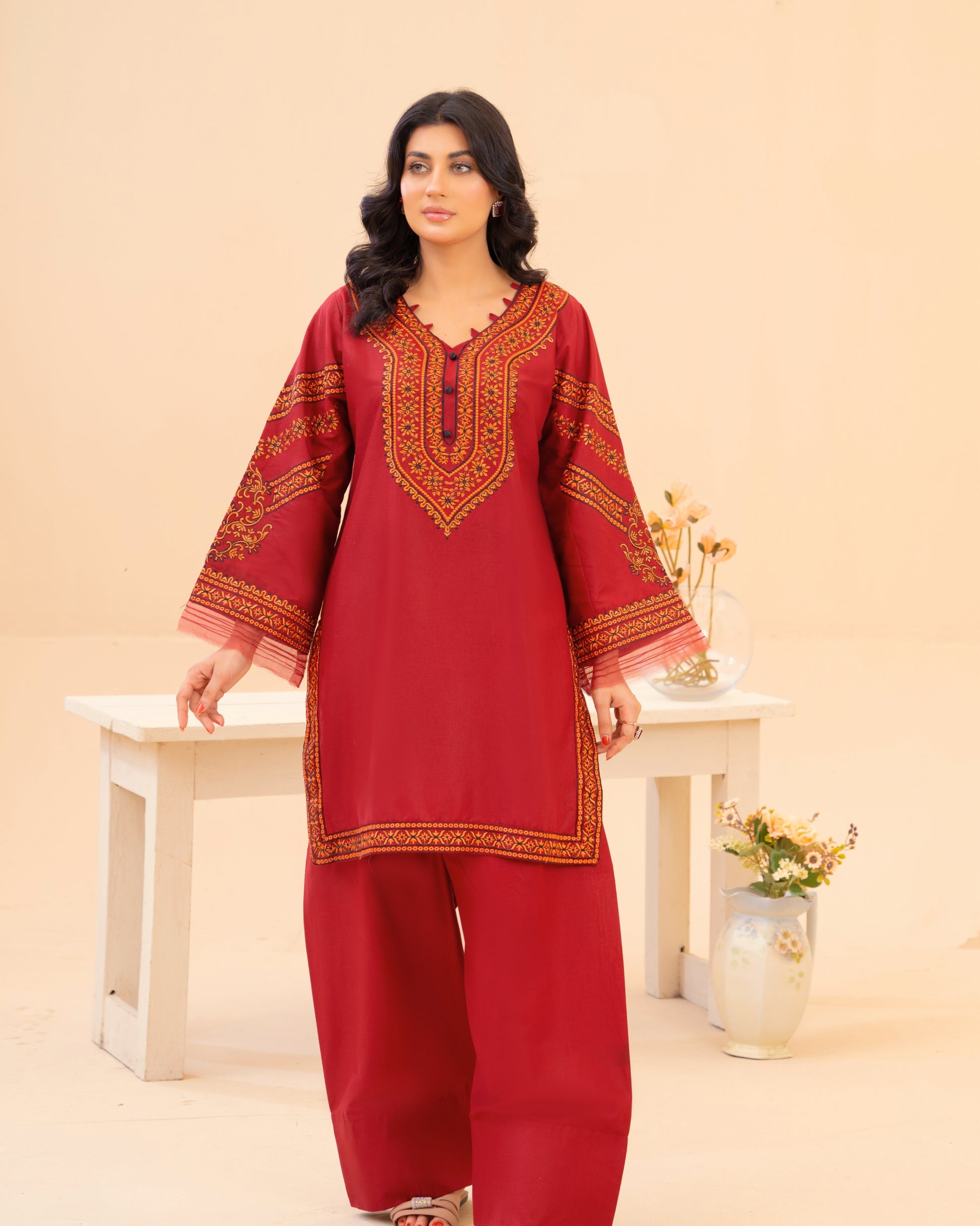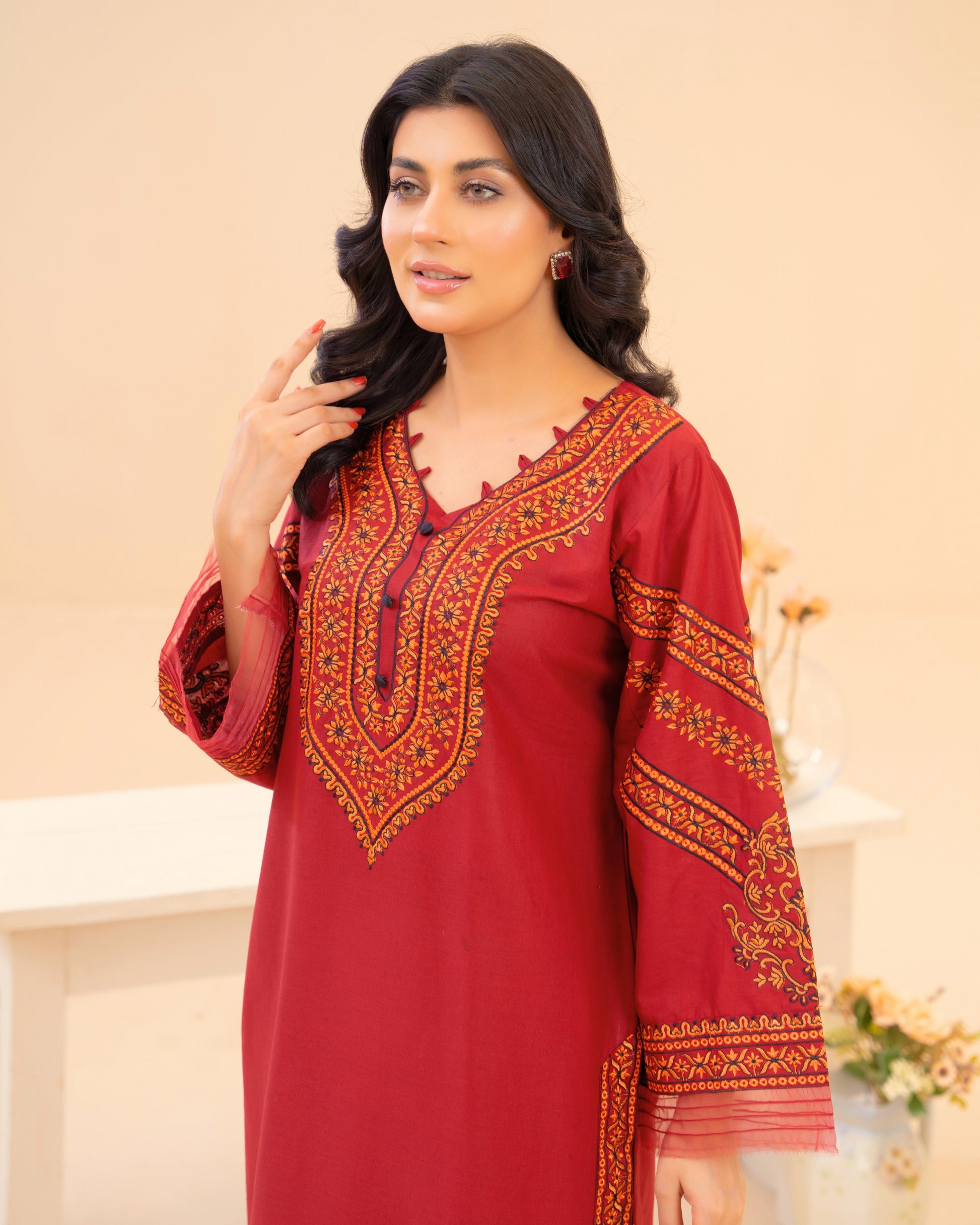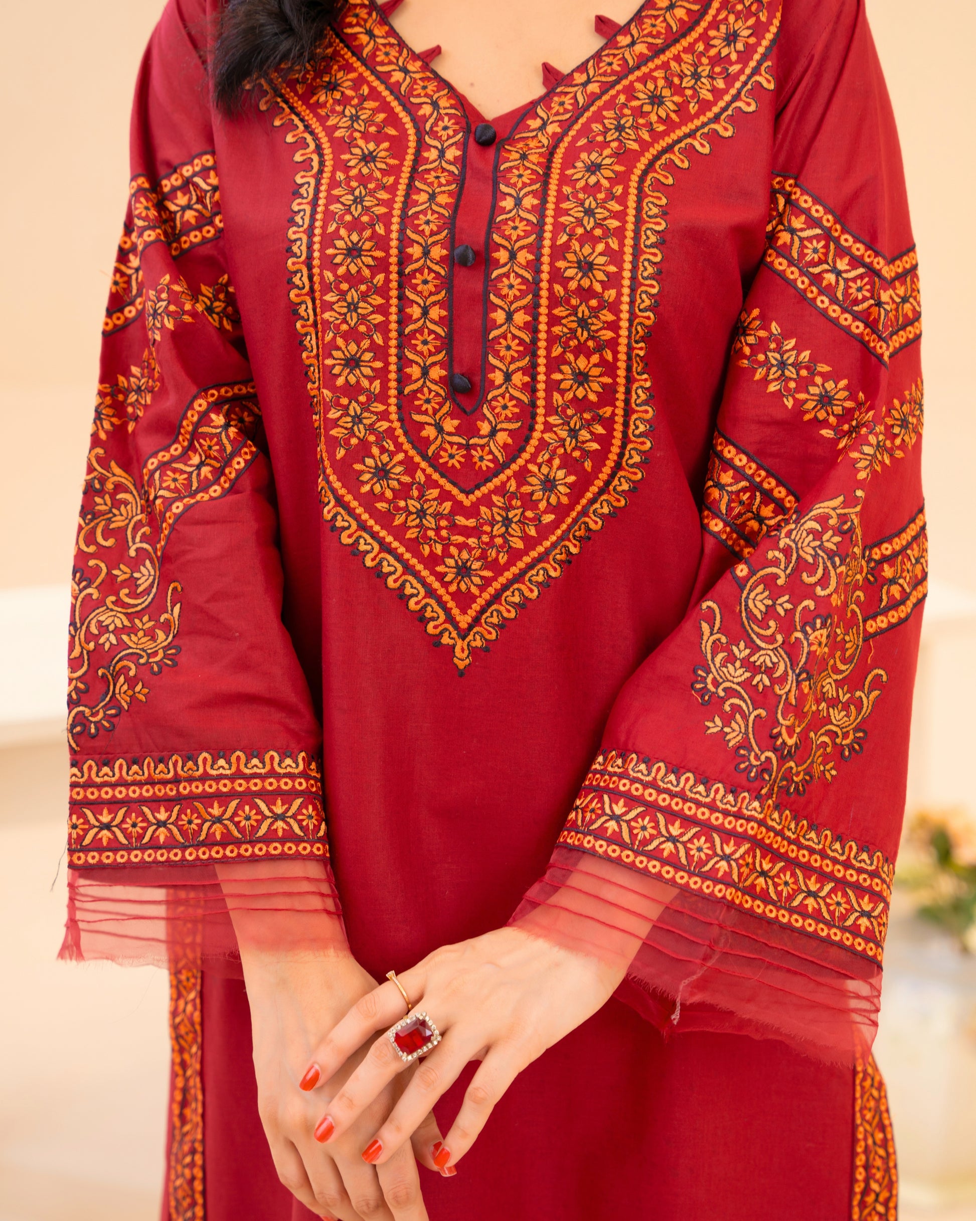 Ruby the colour of celebration & confidence. A rich ruby lawn suit finished with heritage style embroidery that frames the neckline and sleeves like jewellery. Designed in a long, elegant silhouette with wide sleeves and statement borders easy to wear, impossible to ignore.