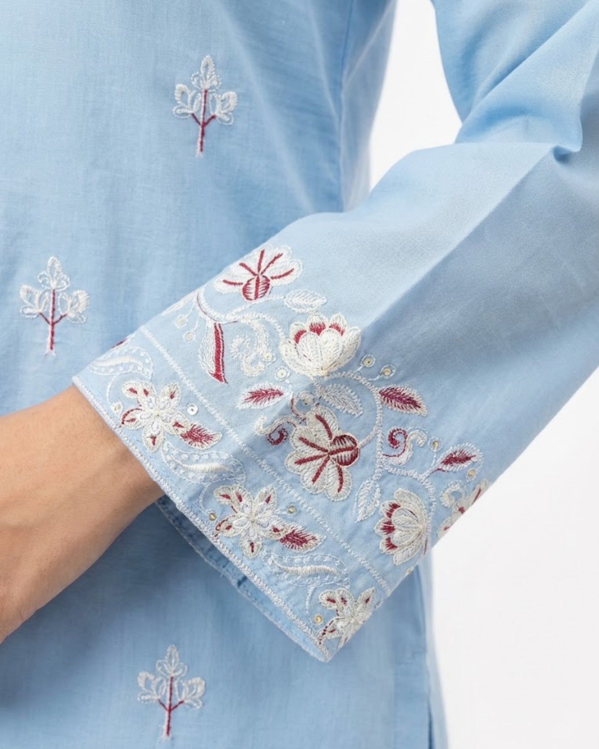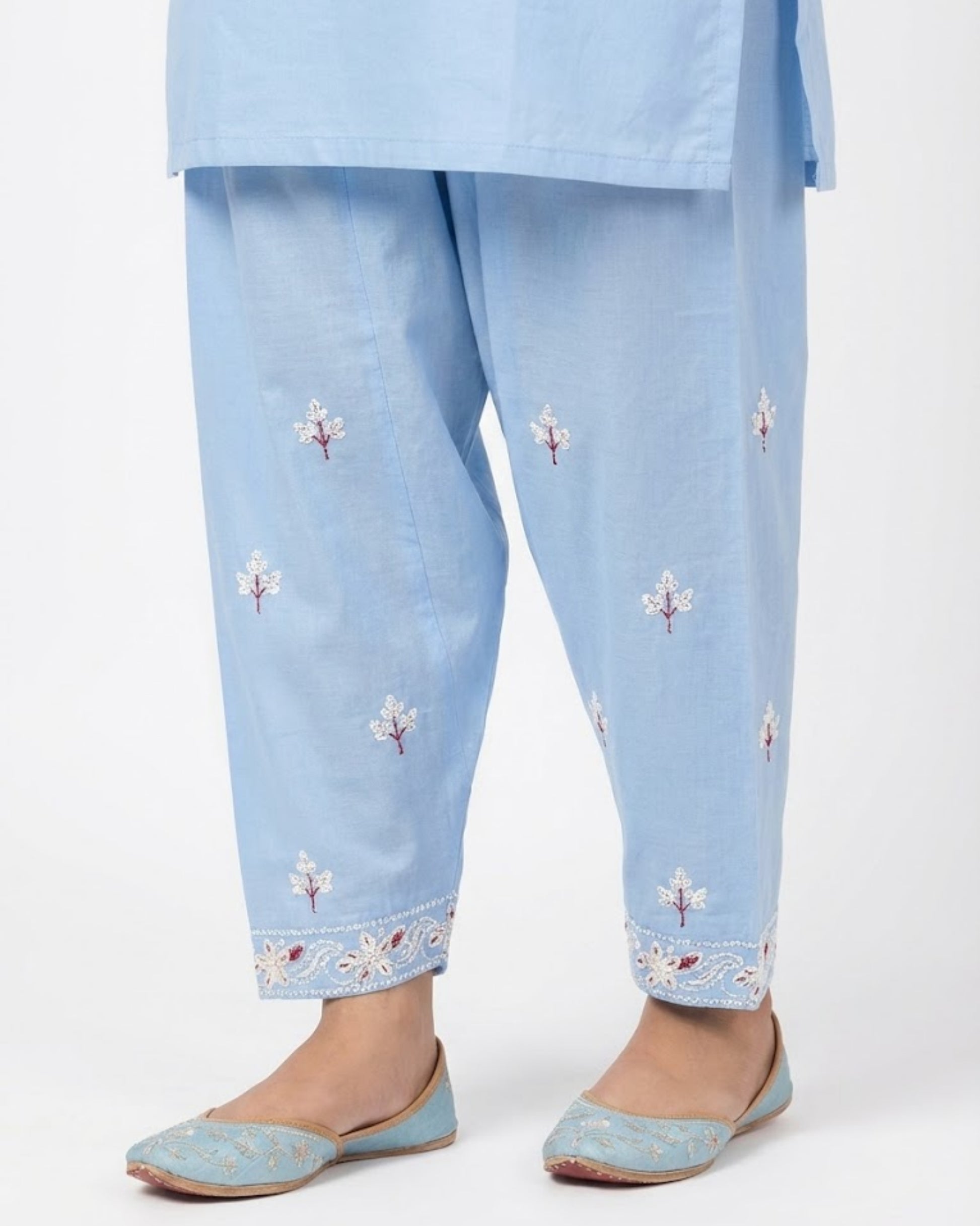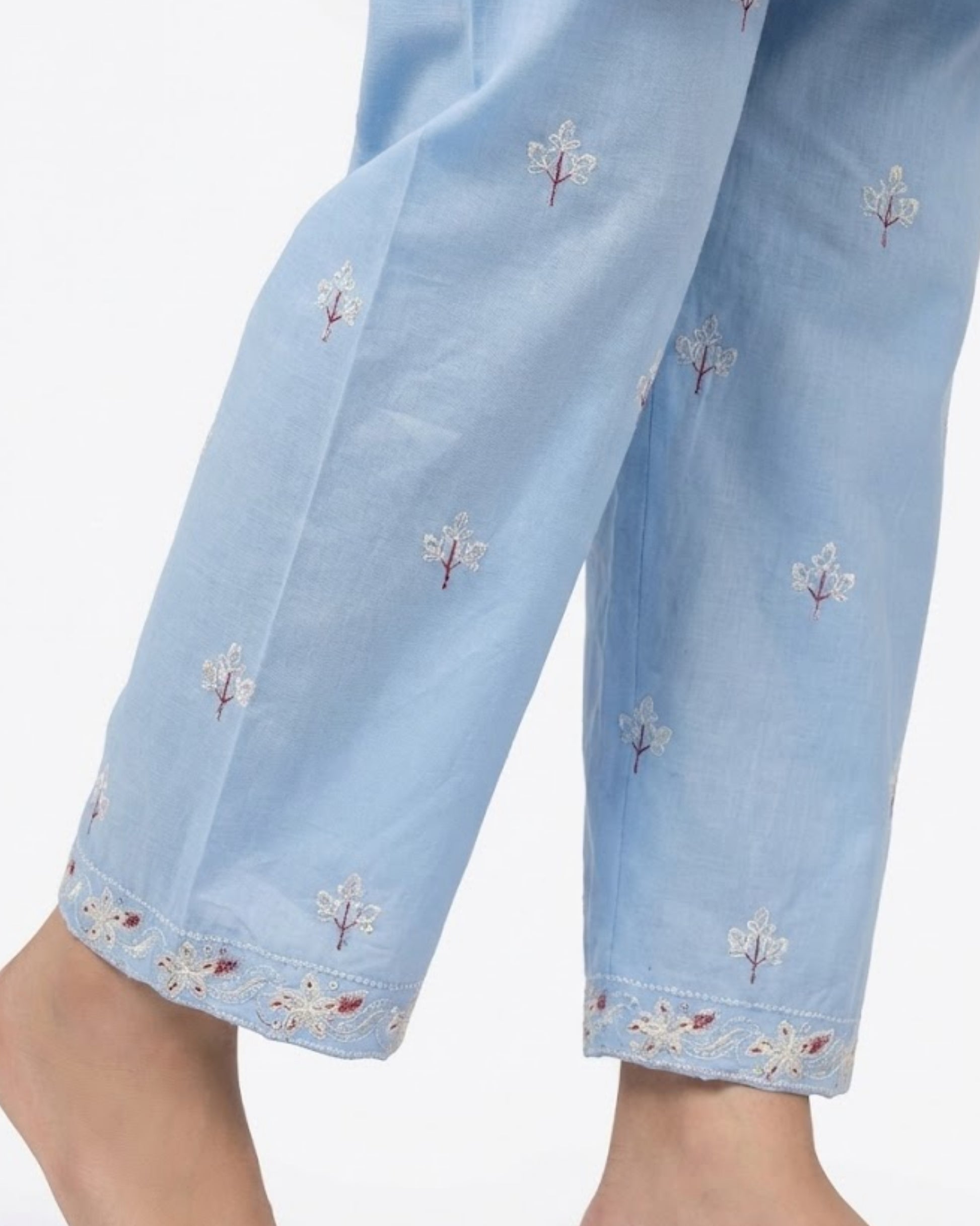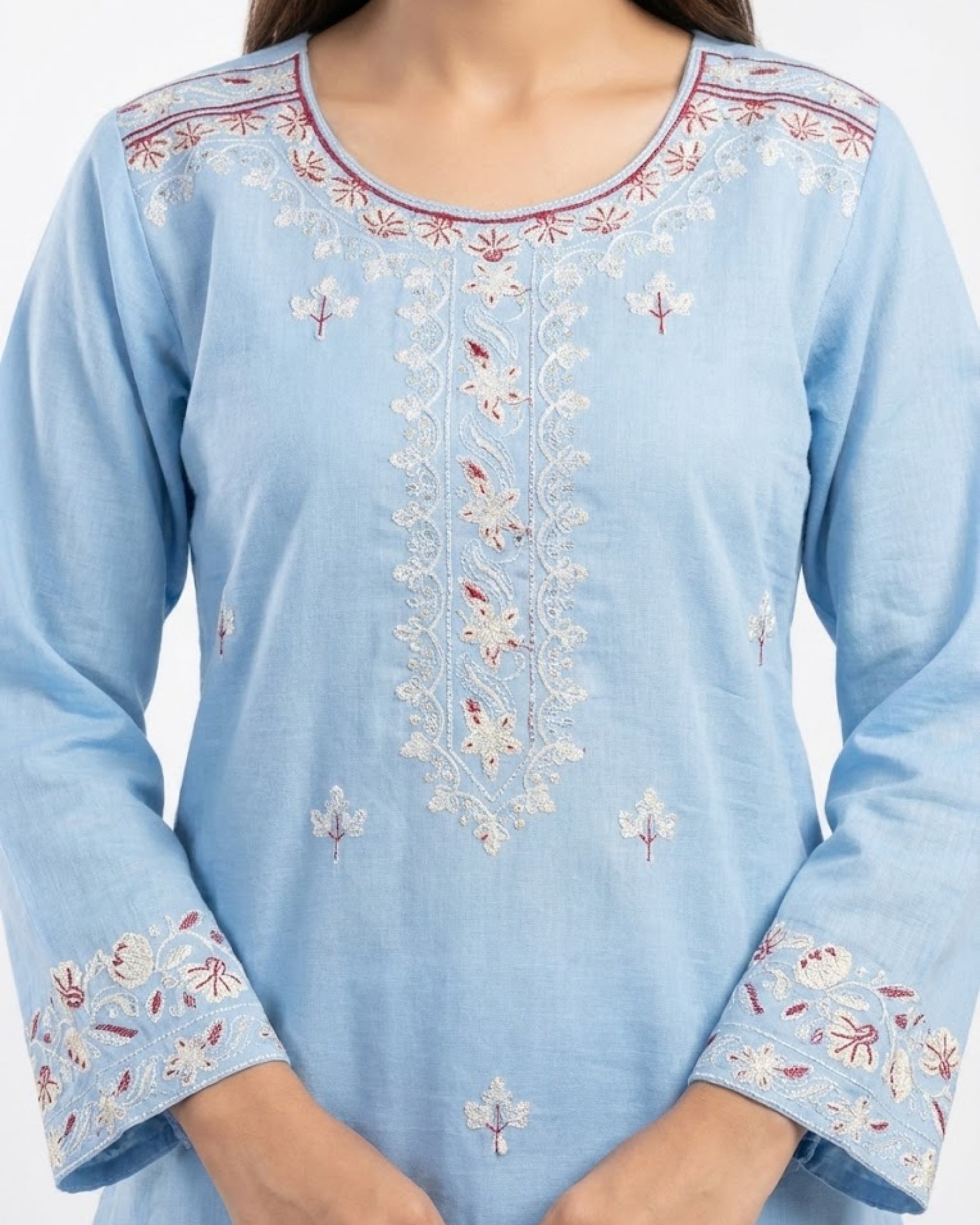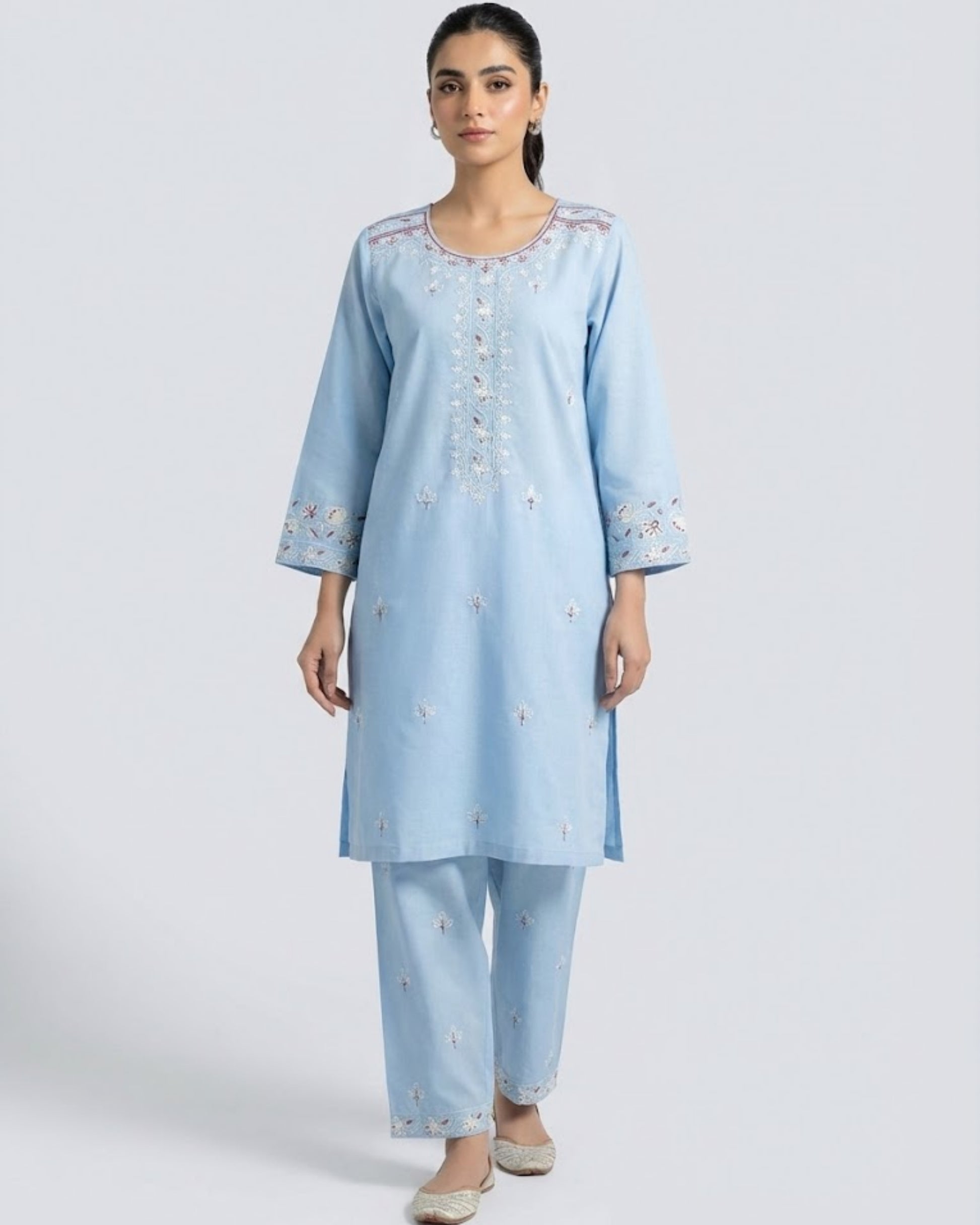 Sahar for the woman who carries softness with strength. A sky-blue 2-piece stitched suit with delicate embroidery that feels light and looks elevated. The neckline and sleeve borders add a festive touch without going over the top. Easy, breathable, and graceful for warm days and special moments. Perfect for Eid mornings, intimate dawats, and summer get-togethers.